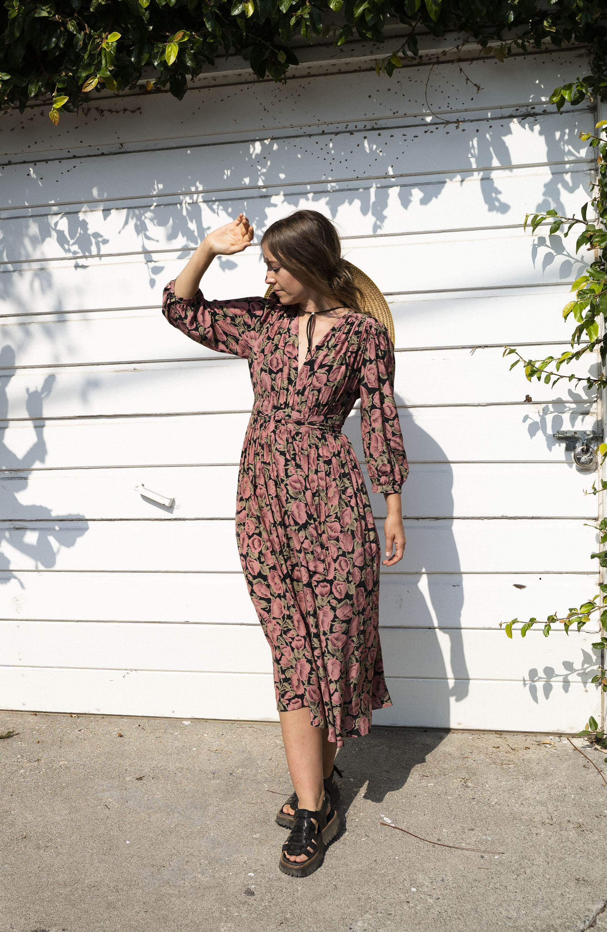 $298A thing of beauty for all seasons. Made of breezy Lenzing certified crepe, the Freya Dress is a midi length dress with an adjustable tie waist, gathered V-neckline, three-quarter length puff sleeves and pockets. For a versatile fit, the entire back body is loose, allowing the waist to be fully adjustable when tied.